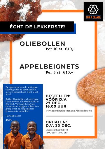 Dit jaar verkopen we oliebollen en appelbeignets! U kunt de oliebollen per zak van 10 stuks bestellen en appelbeignets per zak van 5 stuks. De kosten zijn 10 euro per zak. We verkopen oliebollen met rozijnen en oliebollen zonder rozijnen. Graag vooraf uw bestelling betalen door middel van de betaallink die u in de bevestigingsmail krijgt.